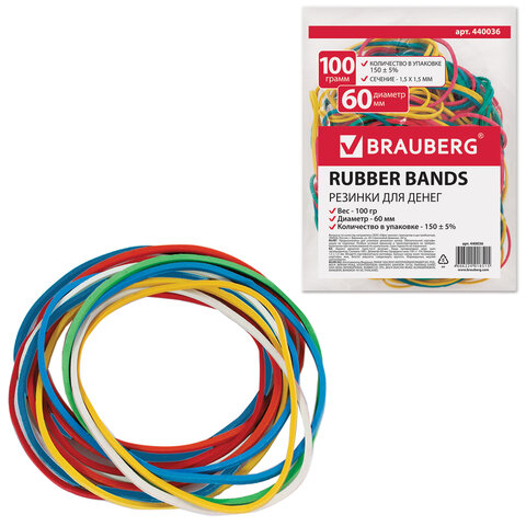 Резинки банковские универсальные диаметром 60 мм, BRAUBERG 100 г, цветные, натуральный каучук, 440036