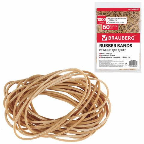 Резинки банковские универсальные диаметром 60 мм, BRAUBERG 1000 г, натуральный цвет, натуральный каучук, 440052