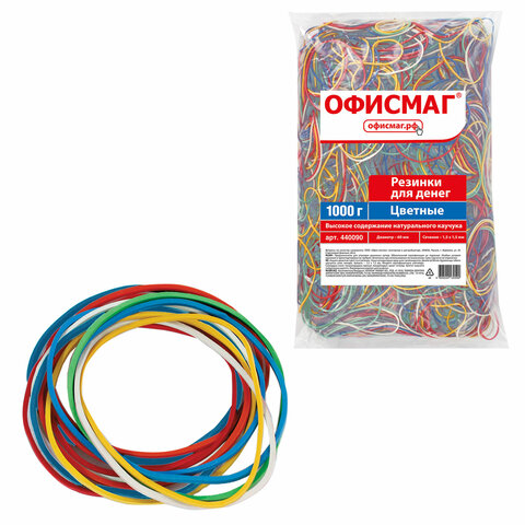 Резинки банковские универсальные диаметром 60 мм, ОФИСМАГ 1000 г, цветные, натуральный каучук, 440090