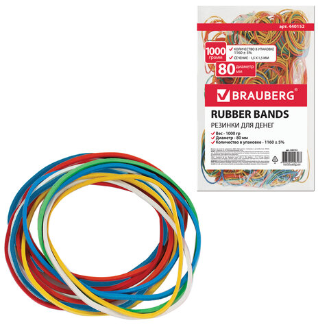 Резинки банковские универсальные диаметром 80 мм, BRAUBERG 1000 г, цветные, натуральный каучук, 440152