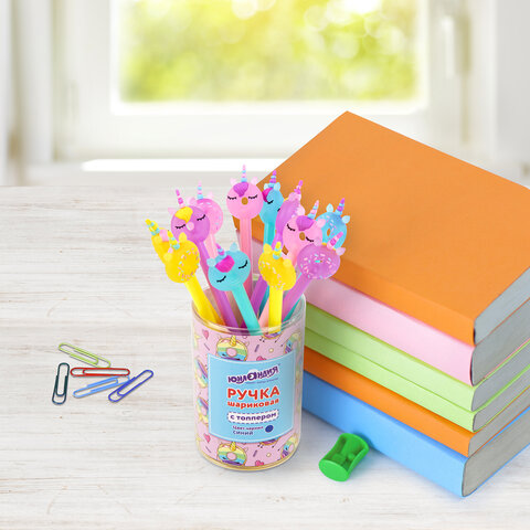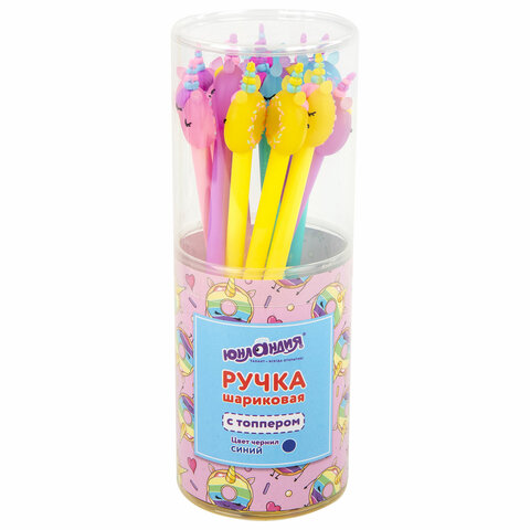 Ручка с топпером шариковая ЮНЛАНДИЯ "Единорог-пончик", корпус ассорти, СИНЯЯ, пишущий узел 0,7 мм, 143803