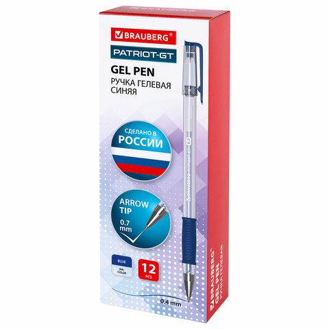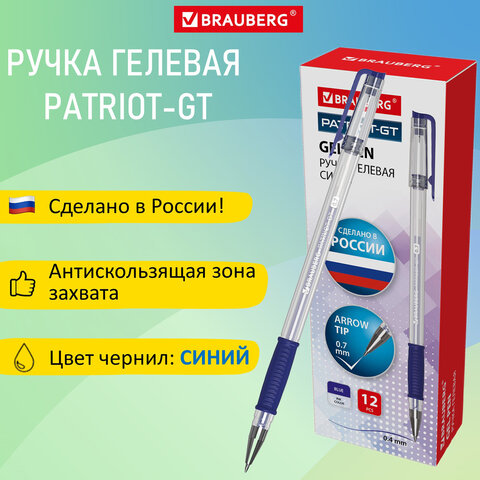 Ручка гелевая РОССИЯ "PATRIOT-GT", СИНЯЯ, корпус прозрачный, узел 0,7 мм, линия письма 0,4 мм, BRAUBERG, 143959