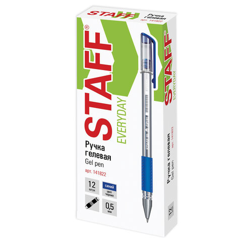 Ручка гелевая с грипом STAFF "EVERYDAY" GP-191, СИНЯЯ, корпус прозрачный, узел 0,5 мм, линия письма 0,35 мм, 141822