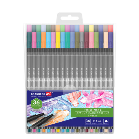 Ручки капиллярные (линеры), 36 ЦВЕТОВ, BRAUBERG ART, "Classic", трехгранные, металлический наконечник, линия письма 0,4 мм, 144150