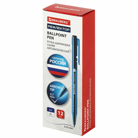 Ручка шариковая автоматическая РОССИЯ "РЕФЛЕКТОР", СИНЯЯ, узел 0,7 мм, линия письма 0,35 мм, BRAUBERG, 143969