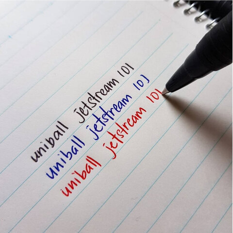 Стильная шариковая автоматическая ручка UNI "JetStream" с масляными чернилами поставляется в круглом корпусе, тонированном в цвет чернил.