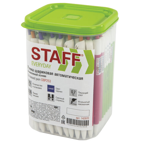 Ручка шариковая масляная автоматическая STAFF "OBP-253", СИНЯЯ, корпус ассорти, узел 0,7 мм, линия письма 0,35 мм, 142970
