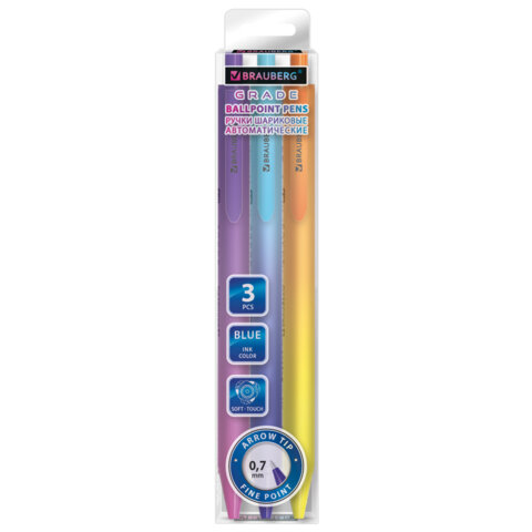 Набор из трех автоматических шариковых ручек BRAUBERG "Grade". Каждая ручка обладает soft-touch покрытием и оригинальным дизайном в стиле градиент на корпусе.