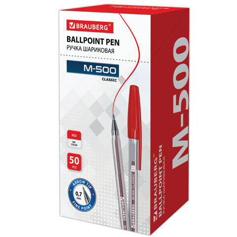 Ручка шариковая BRAUBERG "M-500 CLASSIC", КРАСНАЯ, корпус прозрачный, узел 0,7 мм, линия письма 0,35 мм, 143446