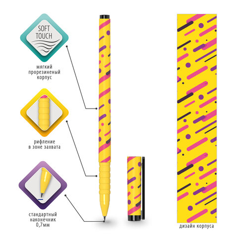 Ручка шариковая BRAUBERG SOFT TOUCH GRIP "LINES", СИНЯЯ, мягкое покрытие, узел 0,7 мм, 143724