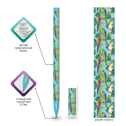 Ручка шариковая BRAUBERG SOFT TOUCH STICK "PARROTS", СИНЯЯ, мягкое покрытие, узел 0,7 мм, 143706