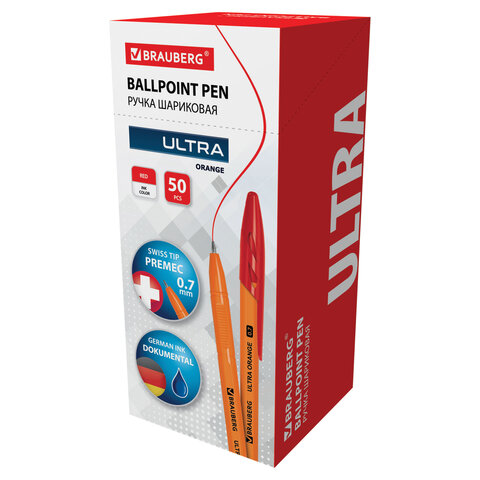 Ручка шариковая BRAUBERG "ULTRA ORANGE", КРАСНАЯ, узел 0,7 мм, чернила ГЕРМАНИЯ, наконечник ШВЕЙЦАРИЯ, 143564