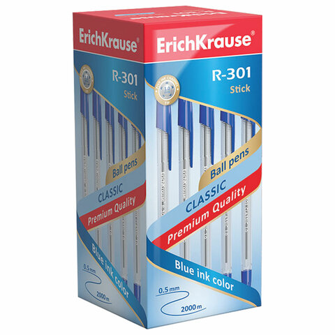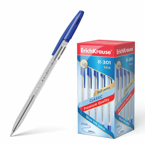Ручка шариковая ERICH KRAUSE "R-301 Classic", СИНЯЯ, корпус прозрачный, узел 1 мм, линия письма 0,5 мм, 43184