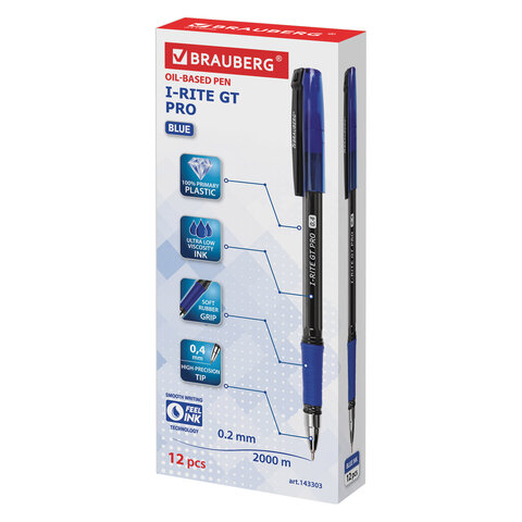 Ручка шариковая масляная с грипом BRAUBERG "i-Rite GT PRO", СИНЯЯ, корпус тонирированный черный, узел 0,4 мм, 143303