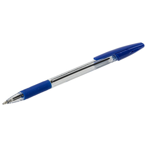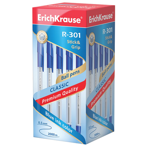 Ручка шариковая с грипом ERICH KRAUSE "R-301 Grip", СИНЯЯ, корпус прозрачный, узел 1 мм, линия письма 0,5 мм, 39527