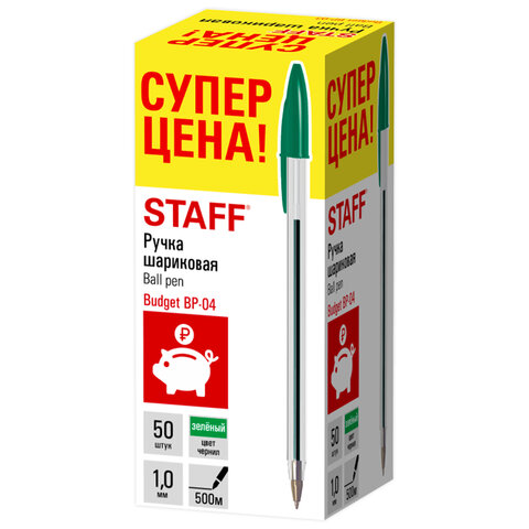 Ручка шариковая STAFF "Basic Budget BP-04", ЗЕЛЕНАЯ, линия письма 0,5 мм, с штрихкодом, 143871