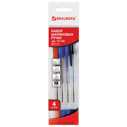 Ручки шариковые BRAUBERG, НАБОР 4 шт., АССОРТИ, "Line", узел 1 мм, линия письма 0,5 мм, 141100
