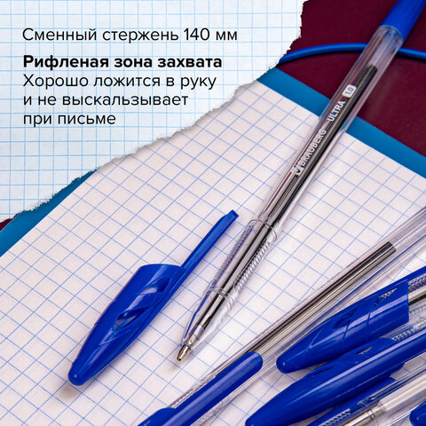 Ручки шариковые BRAUBERG "ULTRA", СИНИЕ, НАБОР 10 штук, корпус прозрачный, узел 1 мм, 143570