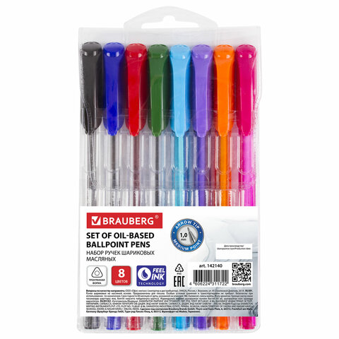 Ручки шариковые масляные BRAUBERG, НАБОР 8 шт., АССОРТИ, "Extra Glide", узел 1 мм, линия письма 0,5 мм, 142140