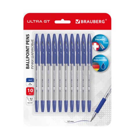 Ручки шариковые с грипом BRAUBERG "ULTRA GT", НАБОР 10 ШТУК, СИНИЕ, линия 0,5 мм, блистер, 144056