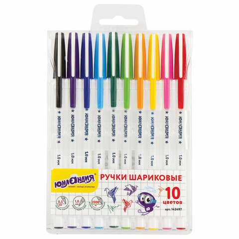 Ручки шариковые ЮНЛАНДИЯ "РАДУГА", НАБОР 10 цветов, длина письма 2000 м, узел 1 мм, линия письма 0,5 мм, 143497