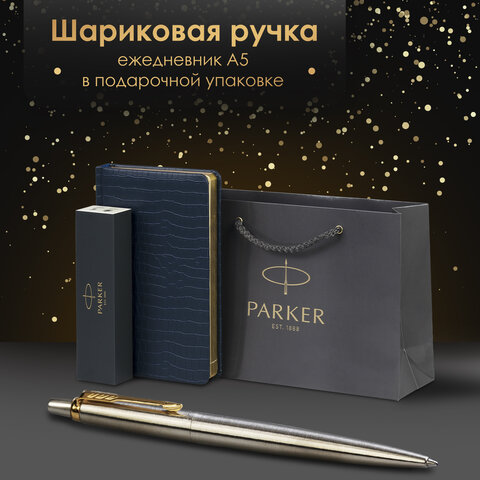 Ручка шариковая PARKER "Jotter Core Stainless Steel GT", ежедневник А5 синий, пакет, 880889