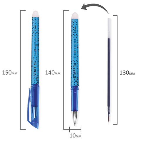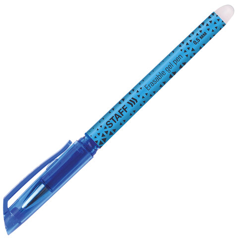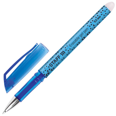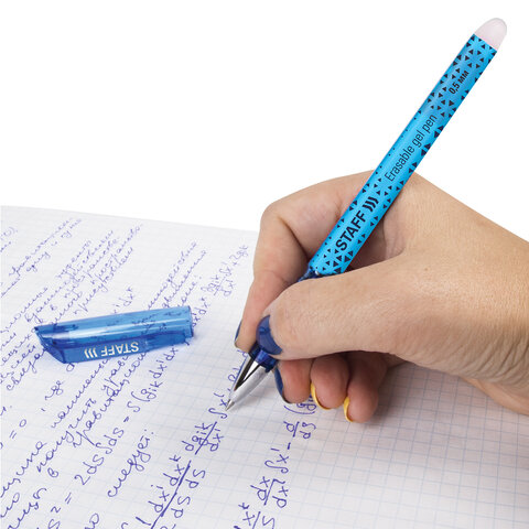 Стираемая ручка STAFF пишет специальными гелевыми чернилами, которые становятся невидимыми при нагревании до 60 °С и выше. Нагрев достигается ластиком, встроенным в корпус ручки. Написанное можно восстановить при температуре ниже -18 °С.