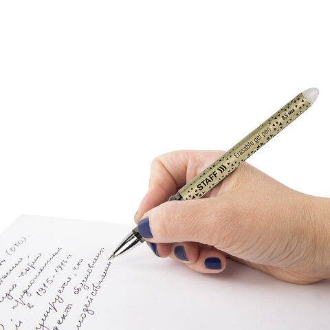 Стираемая ручка STAFF пишет специальными гелевыми чернилами, которые становятся невидимыми при нагревании до 60 °С и выше. Нагрев достигается ластиком, встроенным в корпус ручки. Написанное можно восстановить при температуре ниже –18 °С.