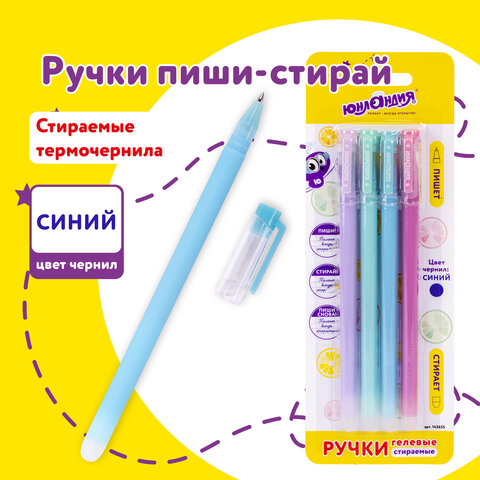 Набор гелевых стираемых ручек ЮНЛАНДИЯ "Лимонад" с удобным прорезиненным корпусом (soft-touch). Ручки пишут специальными гелевыми чернилами, которые становятся невидимыми при нагревании. Нагрев достигается ластиком, встроенным в корпус ручки.