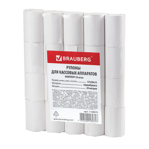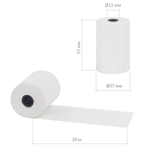 Чековая лента ТЕРМОБУМАГА 57 мм (диаметр 37 мм, длина 20 м, втулка 12 мм) КОМПЛЕКТ 20 шт., BRAUBERG, 110879
