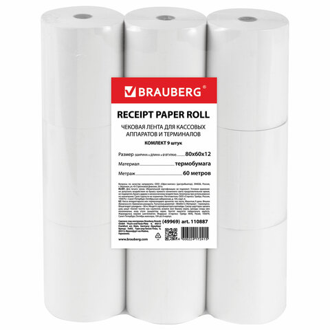 Чековая лента ТЕРМОБУМАГА 80 мм (диаметр 63 мм, длина 60 м, втулка 12 мм) КОМПЛЕКТ 9 шт., BRAUBERG, 110887