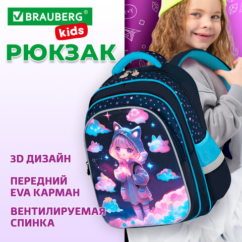 Рюкзак BRAUBERG KIDS FLOSSY, 2 отделения, 3 кармана, "Sky girl", 3D-панель, 40х28х18 см, 273179