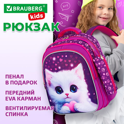 Рюкзак BRAUBERG KIDS MIND с пеналом в комплекте, 2 отделения, "Humble Cat", 40х28х18 см, 273176