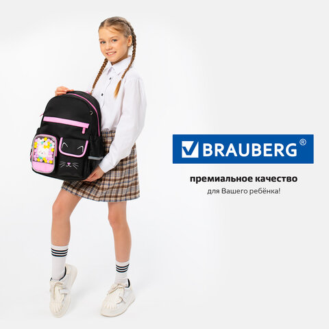 Рюкзак BRAUBERG PASTEL с термонашивками в комплекте, "Black kitty", черный, 40х29х14 см, 273128