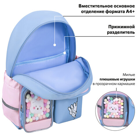 Рюкзак BRAUBERG PASTEL с термонашивками в комплекте, "Friendly bunnies", голубой, 40х29х14 см, 271423