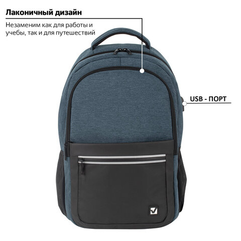 Рюкзак BRAUBERG URBAN универсальный, с отделением для ноутбука, USB-порт, "Denver", синий, 46х30х16 см, 229893