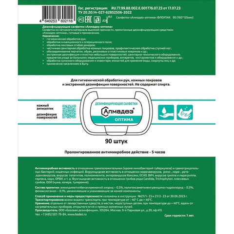 Дезинфицирующие салфетки бесспиртовые 90 шт., АЛМАДЕЗ-ОПТИМА, для обработки рук и поверхностей, САЛ-В-52