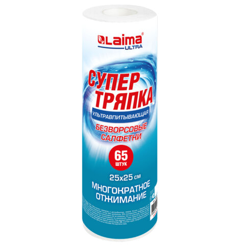 Салфетки БЕЗВОРСОВЫЕ 65 штук, 25х25 см, СУПЕРВПИТЫВАЮЩИЕ многоразовые, ЦЕЛЛЮЛОЗНЫЕ, LAIMA ULTRA, 700991