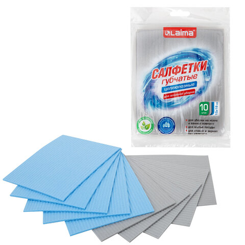 Салфетки губчатые для уборки кухни 15х18 см, ЦЕЛЛЮЛОЗНЫЕ, КОМПЛЕКТ 10 шт., 5 серых / 5 голубых, LAIMA, 700268