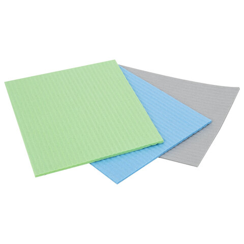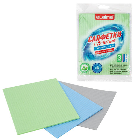 Салфетки губчатые для уборки кухни 15х18 см, ЦЕЛЛЮЛОЗНЫЕ, КОМПЛЕКТ 3 шт., цветные, LAIMA, 700265