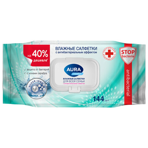 Салфетки влажные 144 шт., AURA Family, антибактериальные, для всей семьи, крышка клапан, 10393