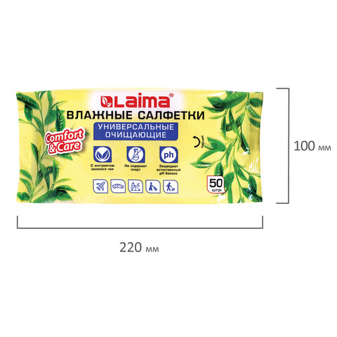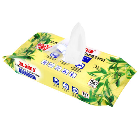 Салфетки влажные 50 шт., УНИВЕРСАЛЬНЫЕ, очищающие для всей семьи, экстракт зеленого чая, LAIMA,128077