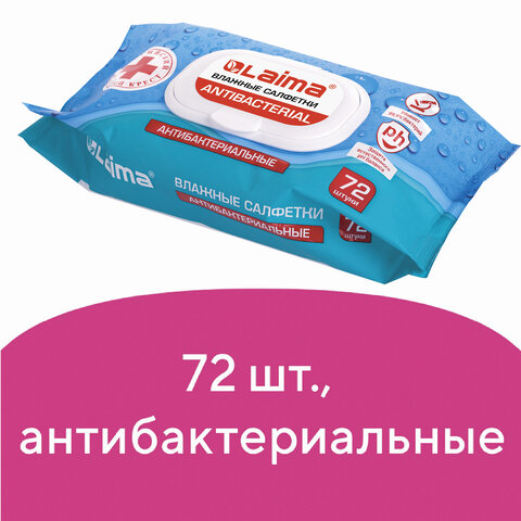 Салфетки влажные 72 шт., АНТИБАКТЕРИАЛЬНЫЕ с пластиковым клапаном, LAIMA "Antibacterial", 129997