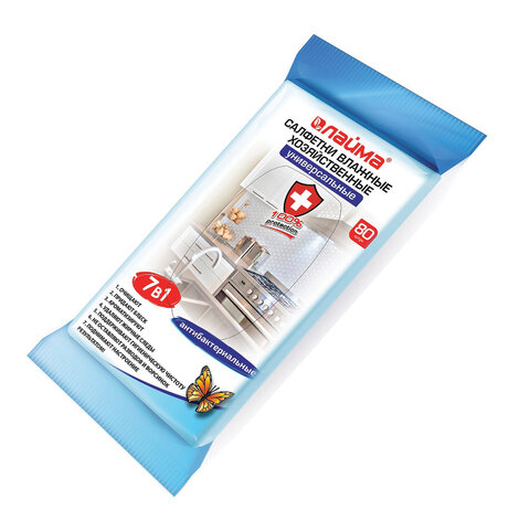 Салфетки влажные хозяйственные LAIMA "УНИВЕРСАЛЬНЫЕ "7 в 1", антибактериальные, 80 шт., 605659