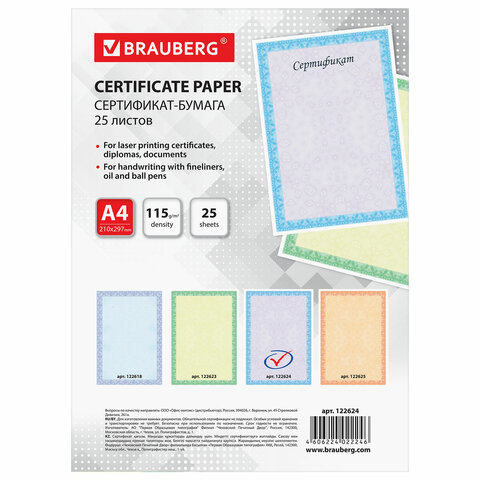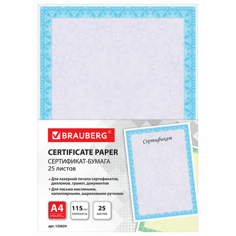 Сертификат-бумага для лазерной печати BRAUBERG предназначена для изготовления сертификатов, грамот, дипломов, памятных и других важных документов. Идеальна для письма масляными, капиллярными и шариковыми ручками.