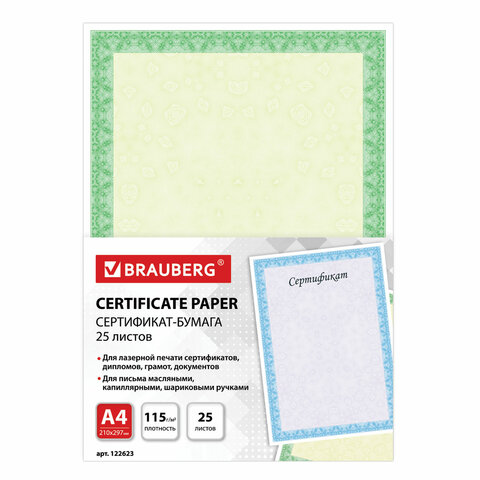Сертификат-бумага для лазерной печати BRAUBERG, А4, 25 листов, 115 г/м2, "Зеленый интенсив", 122623