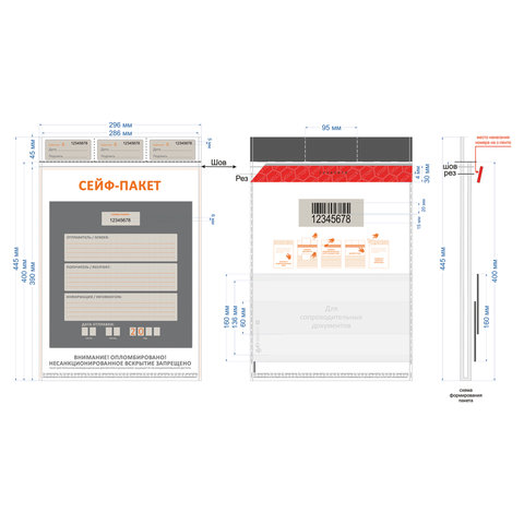 Сейф-пакет изготовлен из непрозрачного, влагонепроницаемого материала, исключающего возможность просмотра вложений и воздействия окружающей среды. Предназначен для пересылки и транспортировки ценных бумаг, договоров, денег и драгоценных металлов.