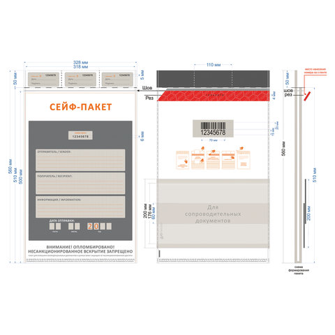 Сейф-пакеты полиэтиленовые, БОЛЬШОЙ ФОРМАТ (328х510+50 мм), КОМПЛЕКТ 50 шт., индивидуальный номер