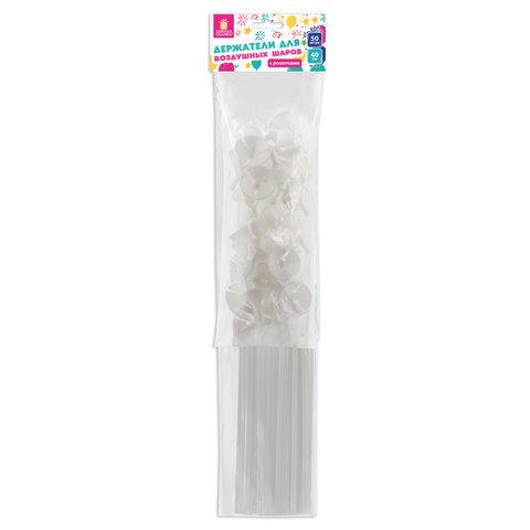 Палочки с держателями для воздушных шаров выполнены из пластика, предназначены для крепления надутых воздушных шаров. В комплекте 50 палочек и 50 розеток-держателей белого цвета.