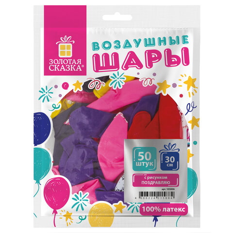 Шары воздушные ЗОЛОТАЯ СКАЗКА, 12" (30 см), КОМПЛЕКТ 50 штук, ассорти 10 цветов, с рисунком "Поздравляю", пакет, 105006